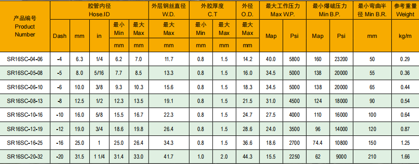 应用:较小弯曲半径的高压液压油基和水基液压系统。优异的脉冲和超过 SAE100R2 和 SAE100R16 标准要求的弯曲性能。胶管拥有更加紧凑的尺寸和较小的弯曲半径 2SN 胶管在机械装配上有更好的性能。内胶:丁腈橡胶增强层:两层编织高强度钢丝外胶:黑色氯丁胶应用温度:-40 ℉至 212 ℉(-40℃至 100℃)应用标准:SAE J517 R16S,ISO 11237 2SC,EN857 -