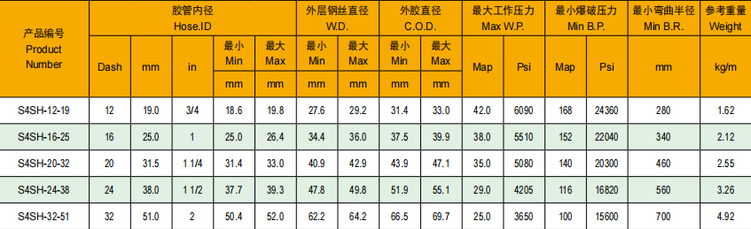 应用:超高压油基流体液压系统输送内胶:氯丁橡胶增强层:四层交互缠绕的高强度钢丝外胶:黑色氯丁橡胶混合物,满足 MT/T98 和 GB/T15907 阻燃标准要求应用温度:-40 ℉至 212 ℉(-40℃至 100℃)技术参数: