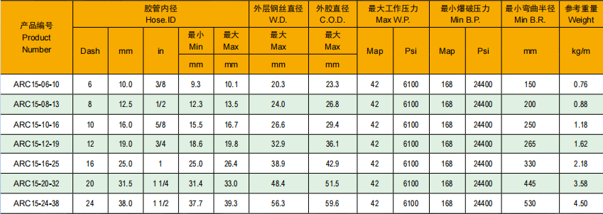 应用:专用于超高压液压系统应用有压力或恒定压力系统, 同时具备优异耐磨。内胶:氯丁橡胶增强层:四层交互缠绕高强度钢丝(尺寸 3/8 英寸,1/2 英寸,5/8 英寸,3/4 英寸和 1 英寸) 和六层交互缠绕高强度钢丝(尺寸 1 1/4 英寸,1 1/2 英寸和 2 英寸)外胶:黑色合成橡胶和耐磨层应用温度:应 -40 ℉至 250 ℉(-40℃至 121℃)应用标准:GB/T 10544 R15