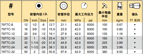 与普通的缠绕管相比,派克的Compact SpiralTM 紧凑型缠绕管797TC在布管、安装、产品尺寸、重量和降低库存等很多方面都显现出巨大的优势。该产品是自25年前派克No-SkiveTM不剥胶技术问世以来,液压软管产品最重大的进步。技术参数:主要特点:• 弯曲半径是SAE标准缠绕管的一半• 弯曲力降低三分之一• 外径比SAE标准缠绕管小将近30%• 两倍的脉冲寿命 – 通过 2,000,00