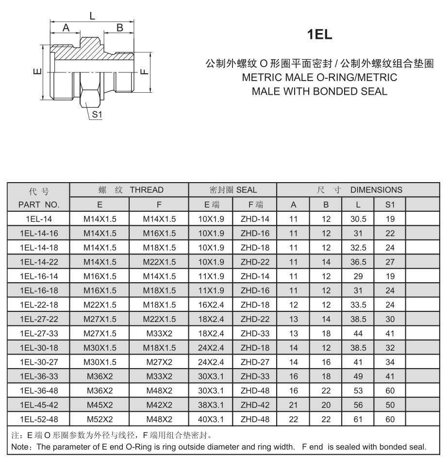 1EL系列直通端面过渡接头公制外螺纹O 形圈平面密封组合垫圈