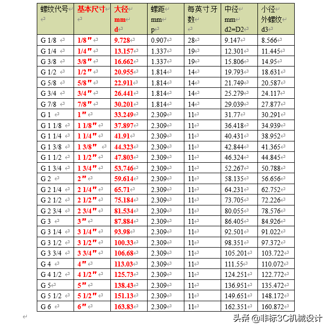 对于G开头的,或者说是对于英制螺纹来说,同样用卡尺量下螺纹的最外面的尺寸,但这个只是大径尺寸(mm),在下表中找多对应的代号: