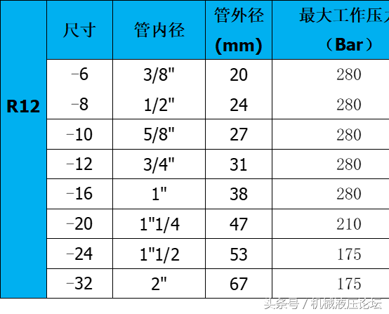 附:常用液压胶管内外径及最高工作压力参数